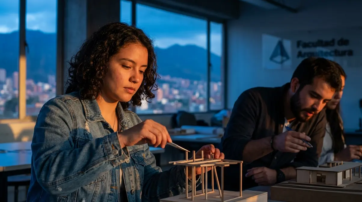 Estudiantes de Arquitectura colaborando en un proyecto en una universidad de Colombia.